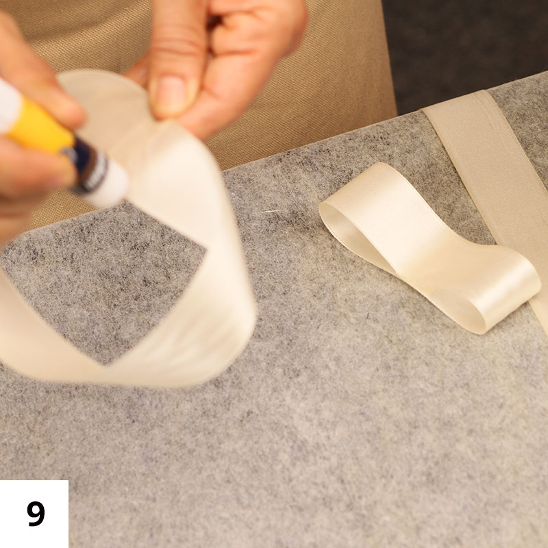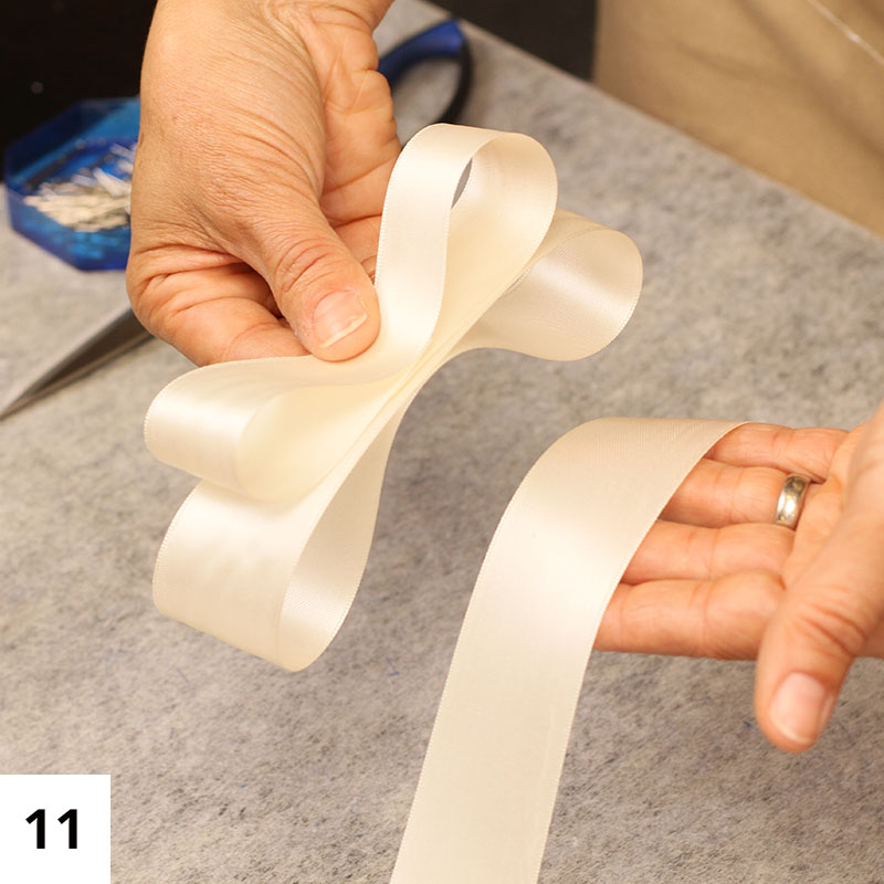 9. Place the longest piece of ribbon as centrally as possible beneath the prepared bow.