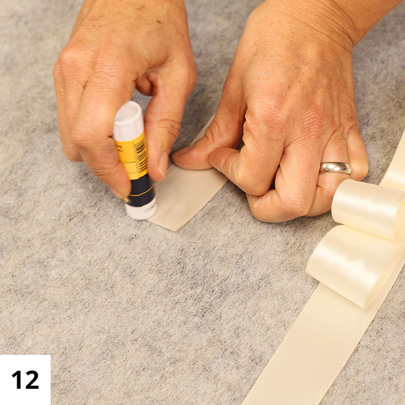 14. Wrap the ribbon tightly around the centre of the bow and glue down the second end.