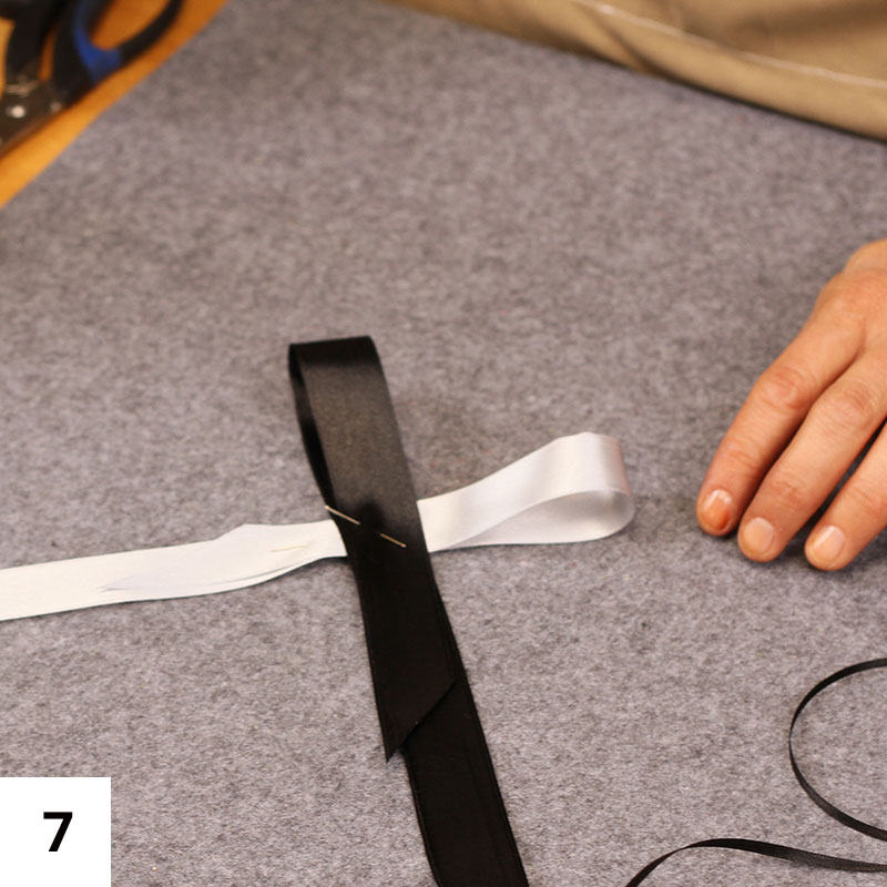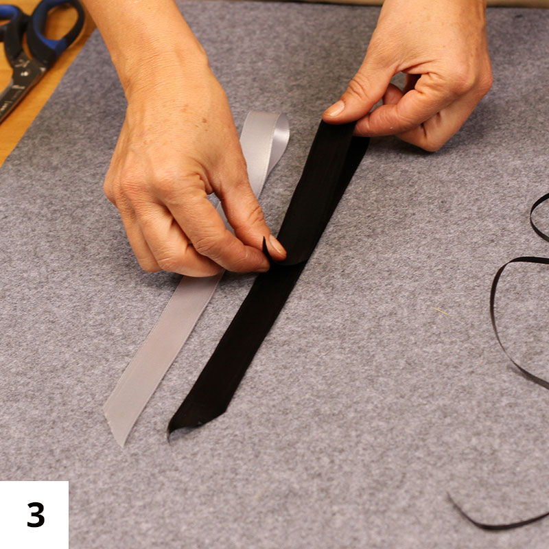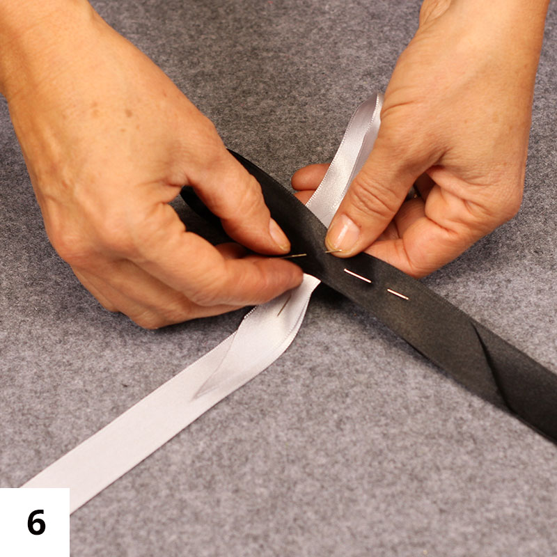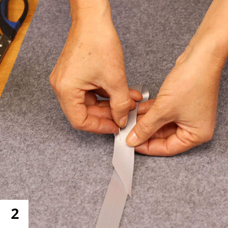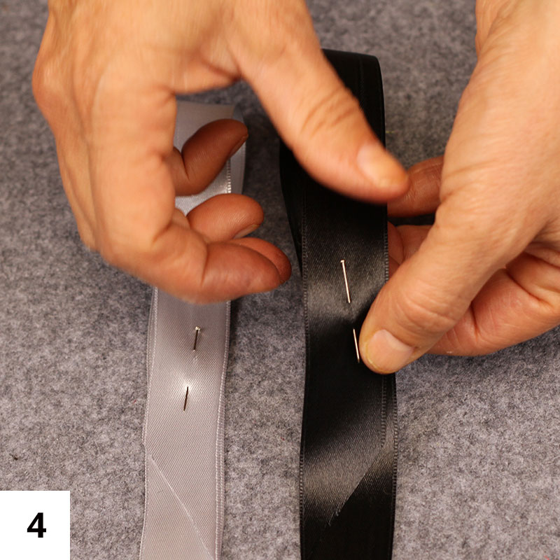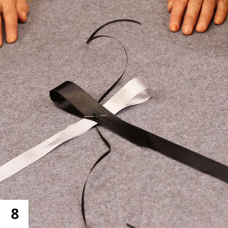 5. Repeat the same process with the second ribbon and pin that loop in place at roughly its centre. Then cross the two loops over each other to create a two-winged bow shape.