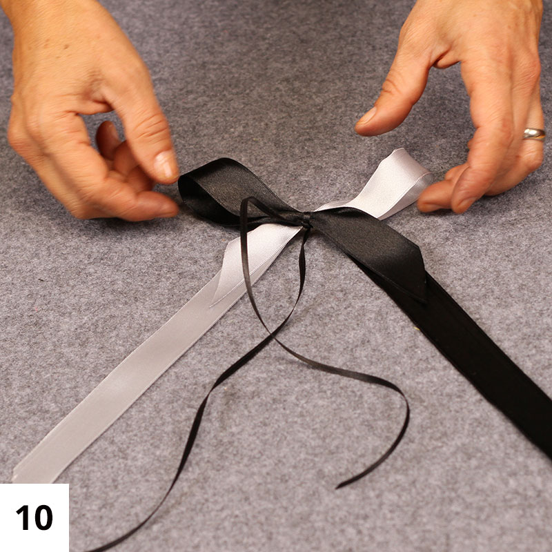 10. Finally, fasten the tie ribbon with a double knot. Tip: for the two-loop bow, always choose ribbons that differ only in colour. Different widths or materials would be too much.